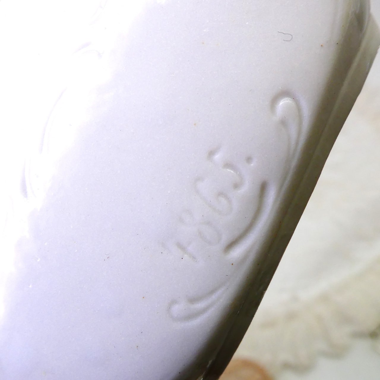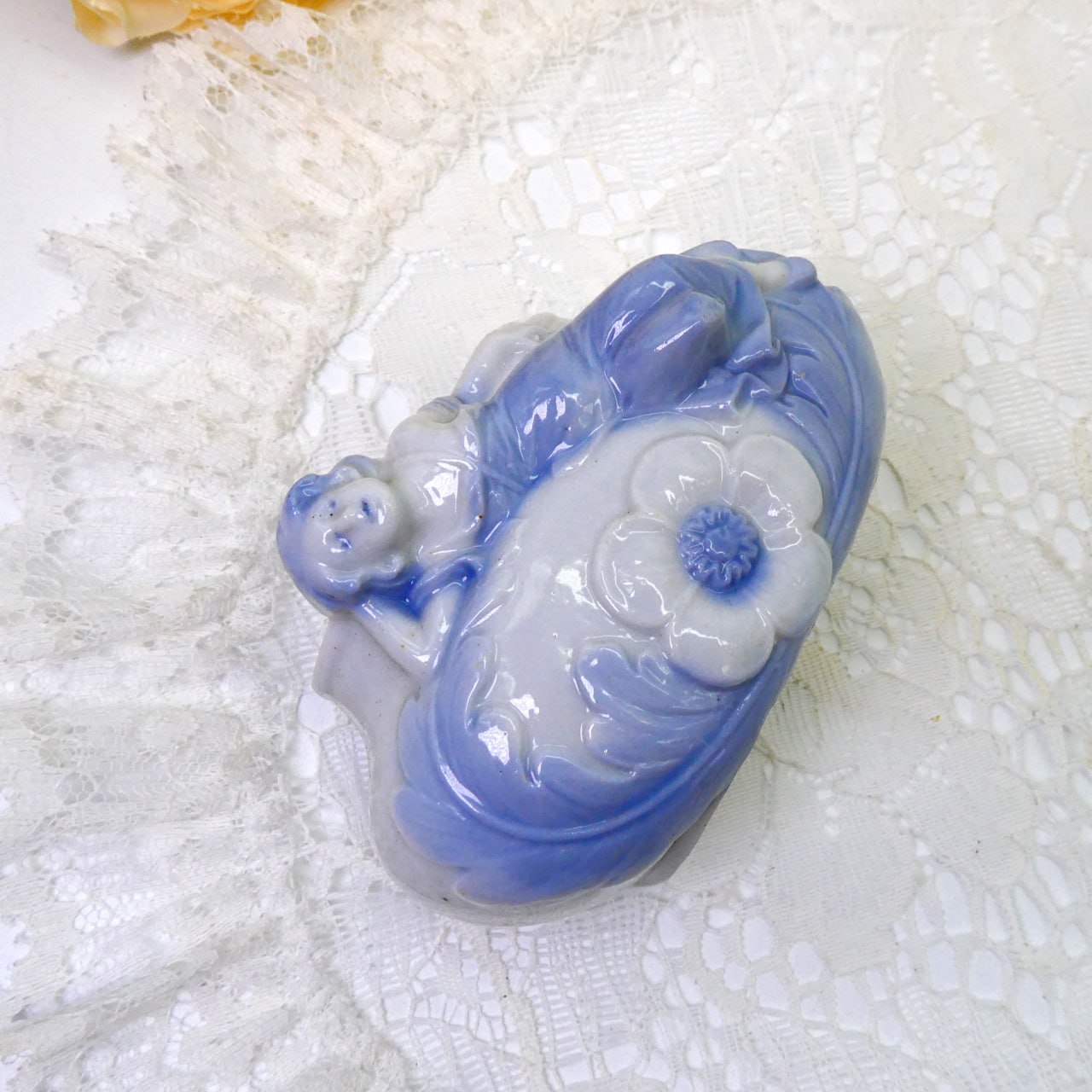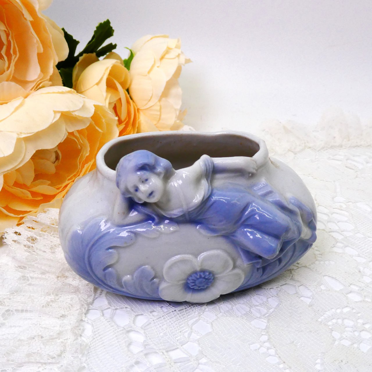 Антикварная низкая вазочка из тонкого фарфора, с объемным барельефом, в мягкой пастельно-голубой гамме с плавным переходом цвета и скульптурным декором. Ар-нуво (Jugendstil) стиль, с плавными линиями, природными мотивами и мягкой романтичной эстетикой. Конец XIX – начало XX века.