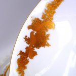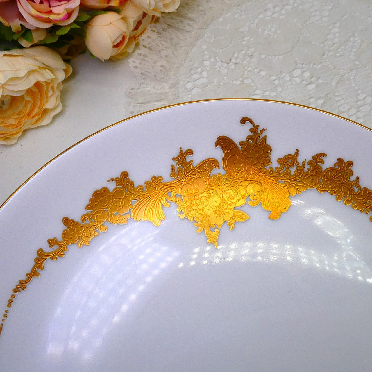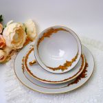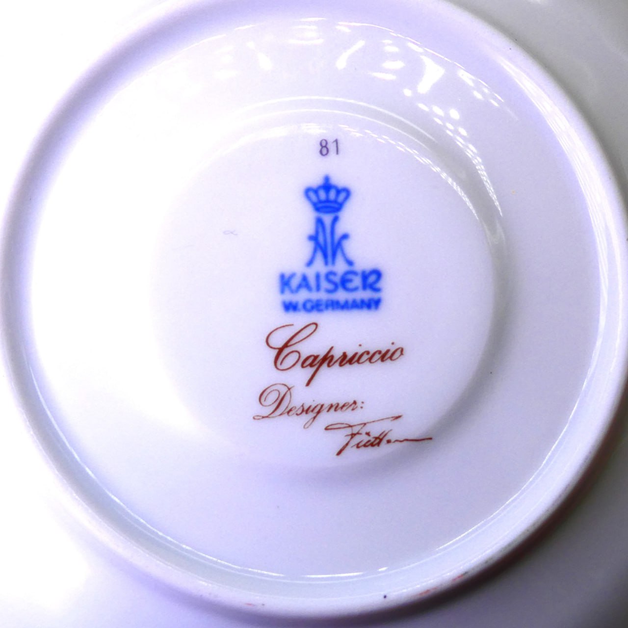 Чайное трио «Capriccio» от Kaiser . Украшено широким орнаментом из позолоты с рельефным рисунком, включающим стилизованные цветы и птиц. Золотая кайма по краям придаёт этому трио изысканный и роскошный вид. Год изготовления примерно 1981.