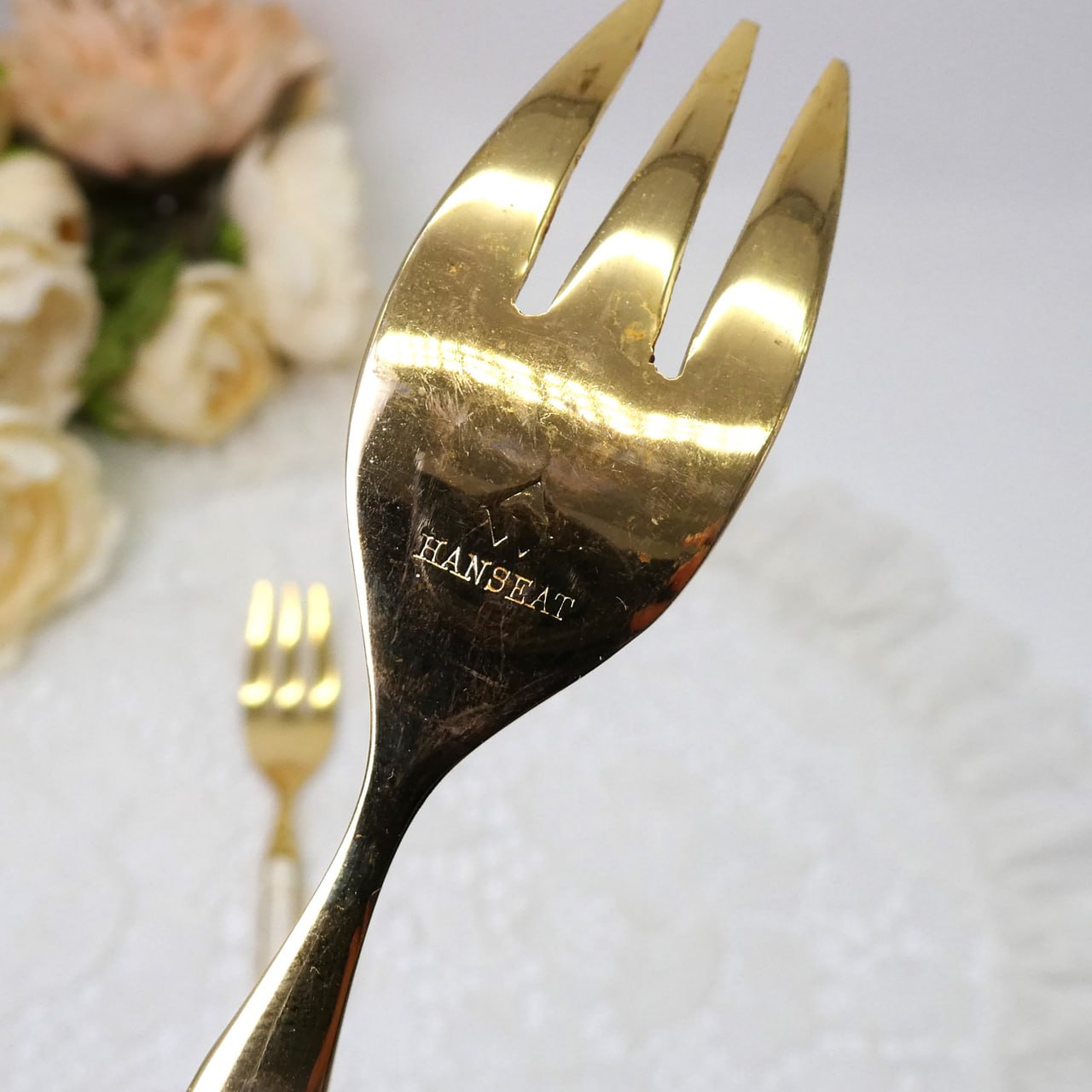 Пара десертных вилочек. Металл, скорее всего, позолоченный. Длина 14см. Продаются вместе.