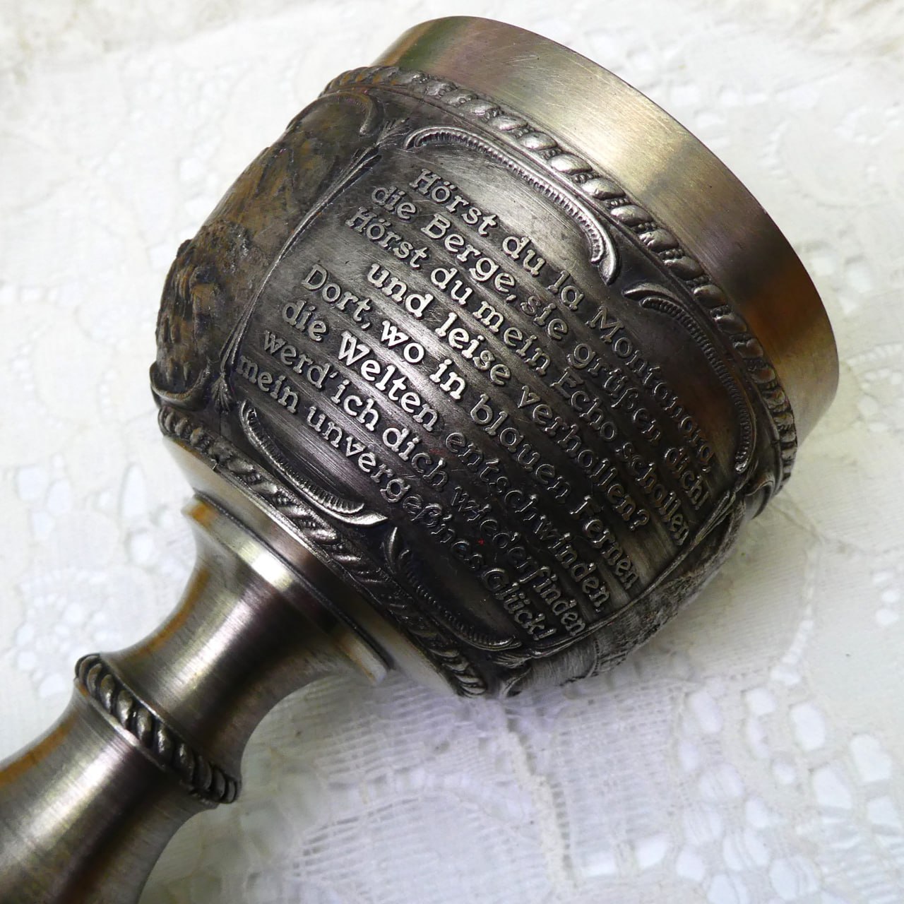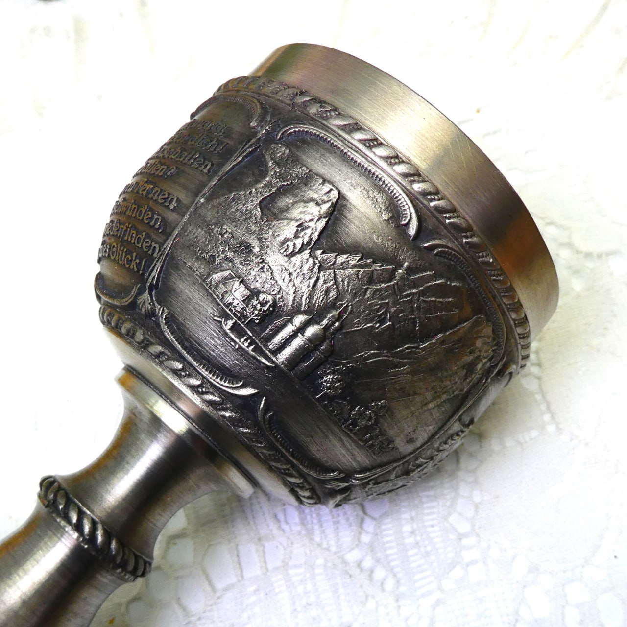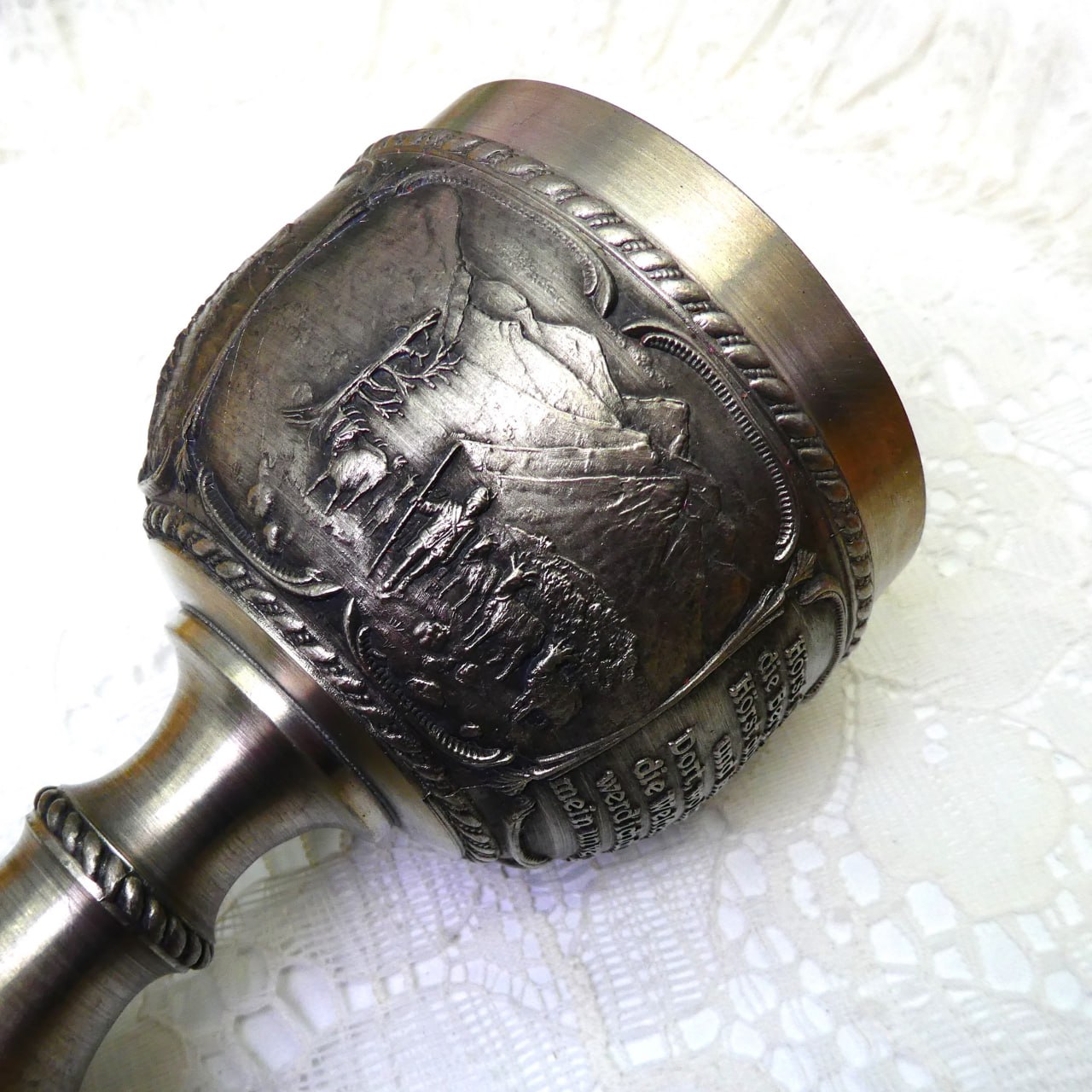 Элегантный устойчивый оловянный кубок с объемным барельефом. На нижней части есть клеймо.