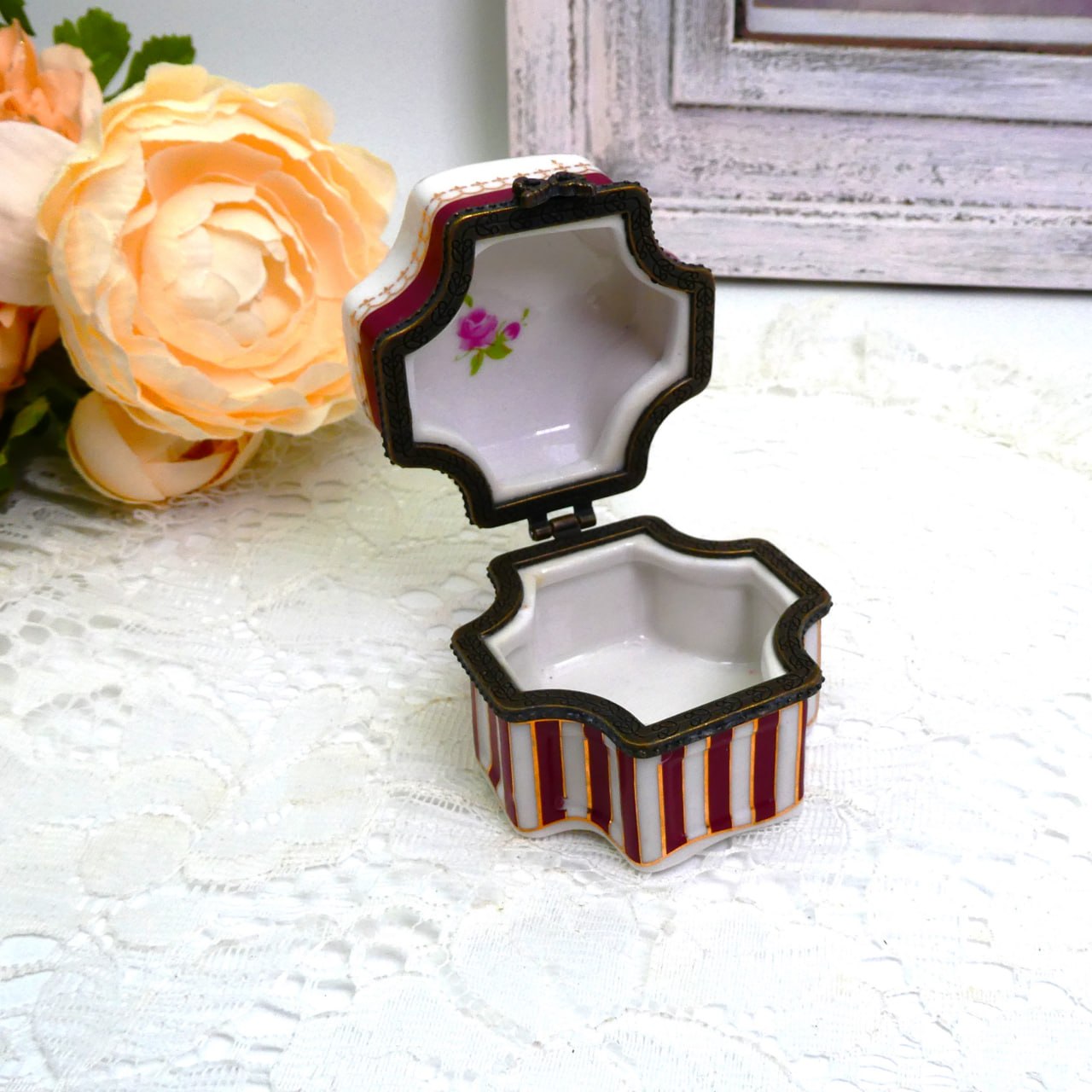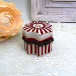 Фарфоровая шкатулочка. Корпус украшен вертикальными полосами с тонкой золотой окантовкой. Высота 4см, размер основания 5см х 5см. Маркировки нет. Сокровища, которые мы продаем, не новые, они винтажные и прожили прошлую жизнь. Поэтому имейте в виду, что могут присутствовать незначительные несовершенства и недостатки. Пожалуйста, внимательно изучите фотографии перед покупкой.