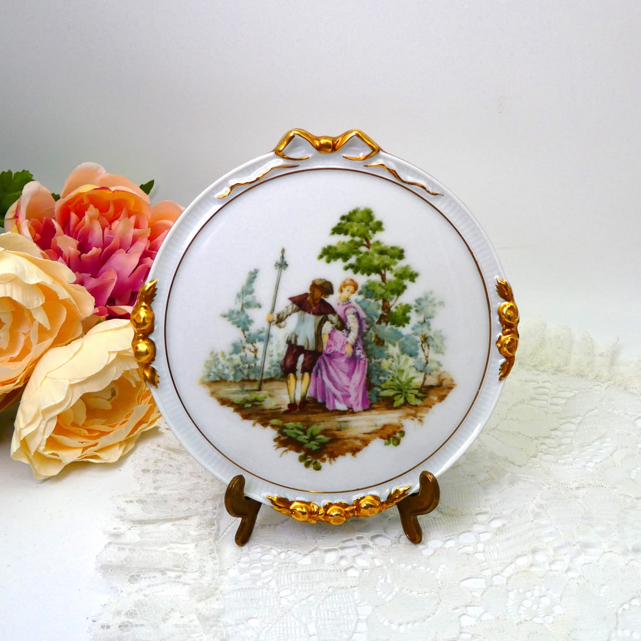 Прелестное фарфоровое панно от мануфактуры KAISER в стиле барокко - пасторальная сценка, позолоченные элементы, объемный декор.