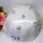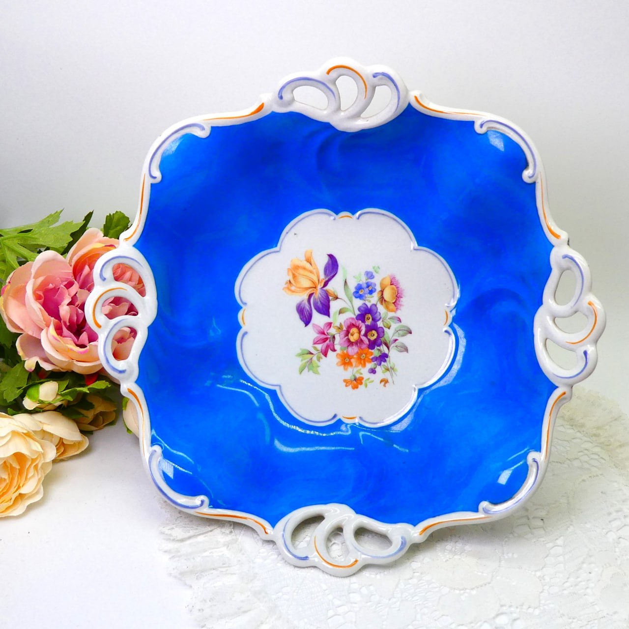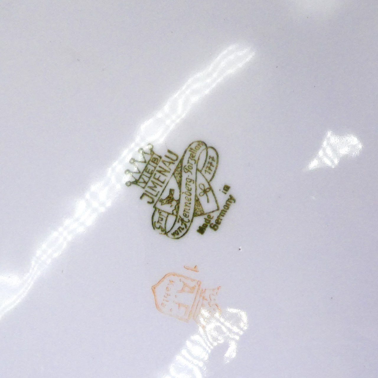 Глубокое блюдо с ножками, производство Graf von Henneberg Porzellan, фабрика в Ильменау (Германия, Тюрингия). Клеймо с короной и надписью Ilmenau, использовавшееся в период 1969–1973 годов. На синем крытье есть пара пятен. В центре — живописная букетная композиция.