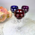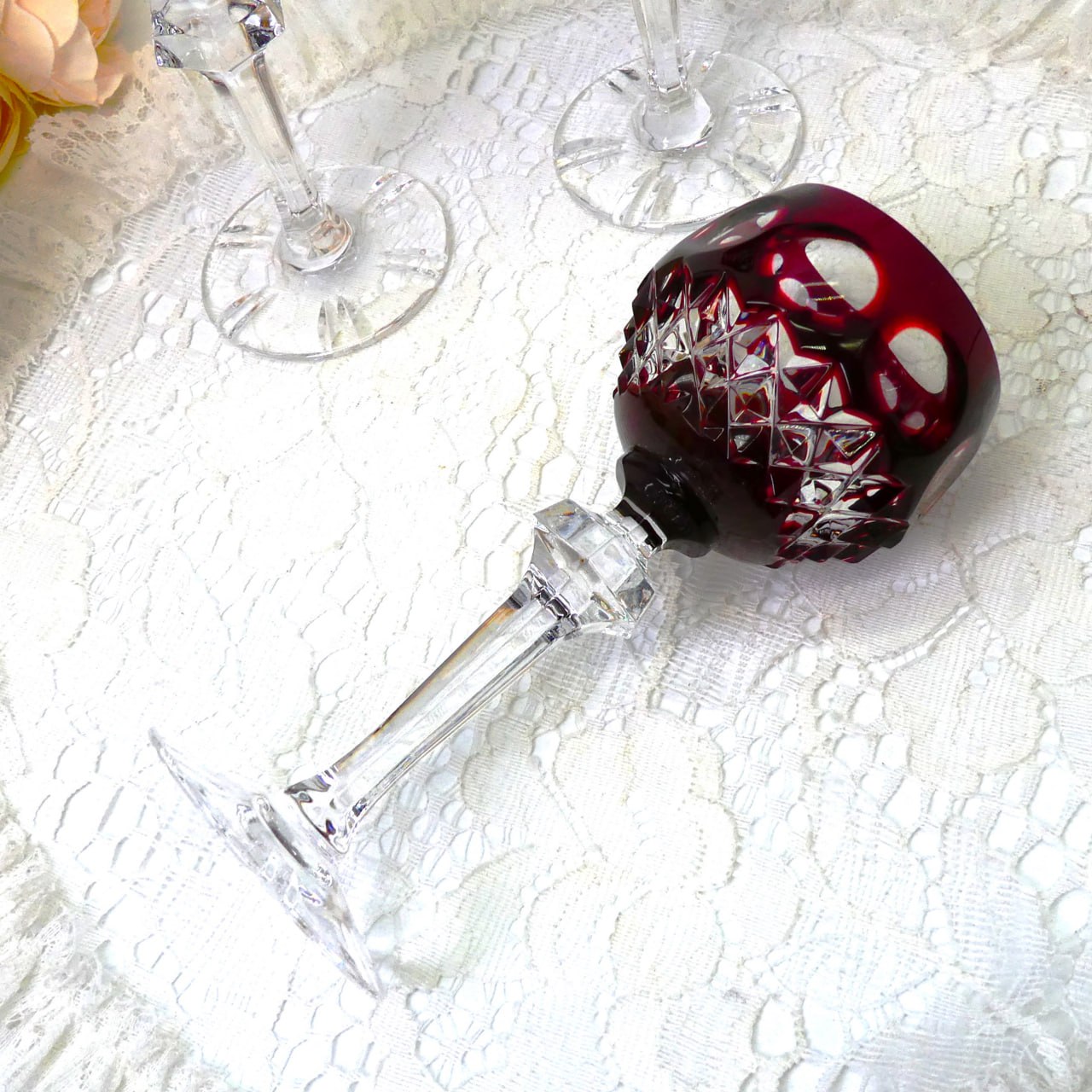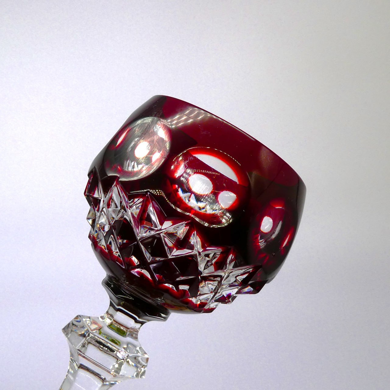 Элегантный ликёрный бокал из немецкого хрусталя, выполненный в технике «цветного слоя» (overlay): поверх прозрачного хрусталя нанесён насыщенный рубиновый слой, частично снятый при огранке, что создаёт эффектный контраст и игру света. Чаша округлой формы украшена крупной алмазной гранью в виде ромбов и «окон» (медальонов), характерных для немецкого стеклоделия середины XX века. Ножка прозрачная, с утолщённым шестигранным узлом и дисковым основанием, придающим изделию устойчивость и утончённый силуэт.