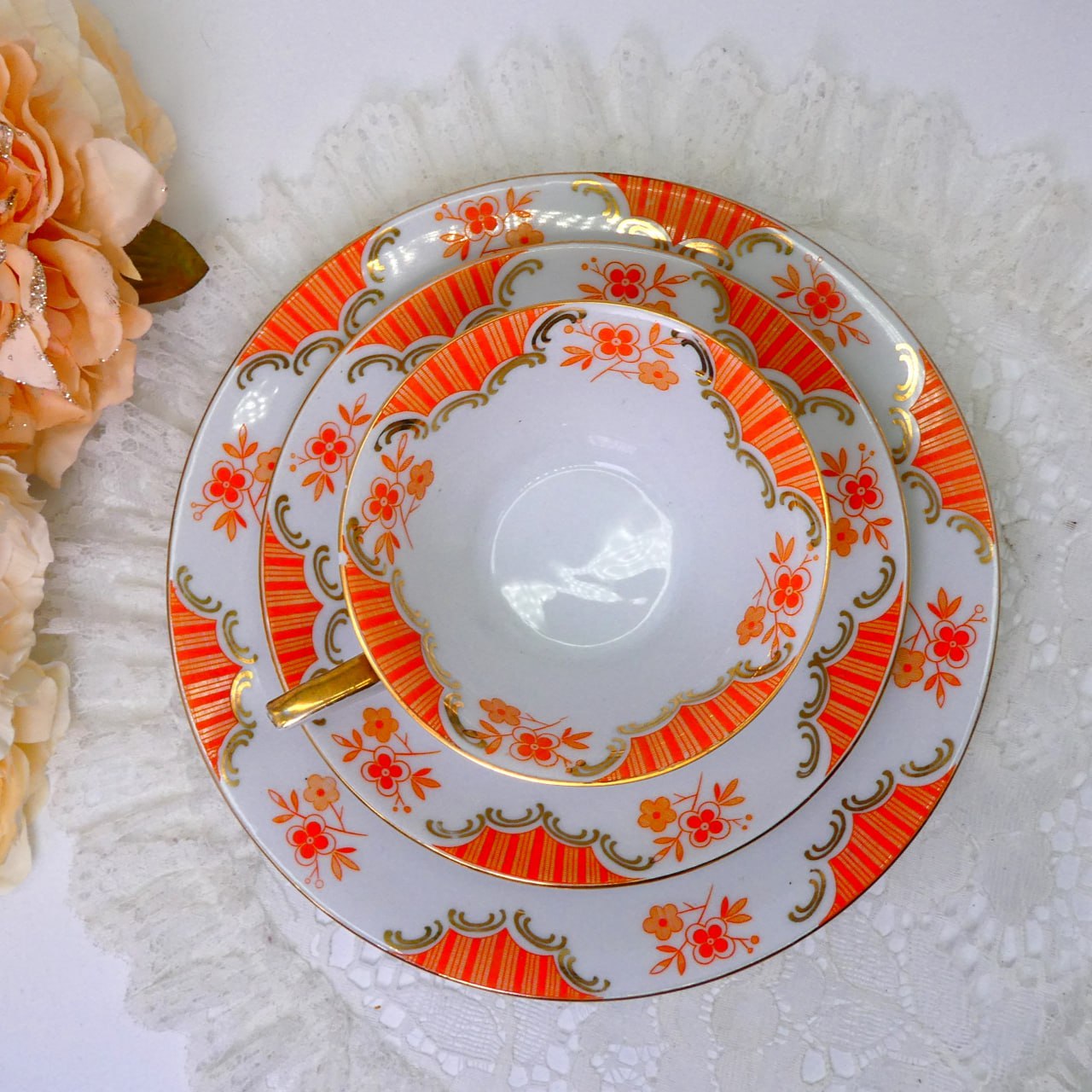 Это трио прекрасно! Но ,к сожалению ,имеет небольшой дефект в виде скола на ободке чашки. Продается по сниженной цене.