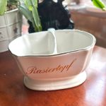 Вот такая кружка для бритья - с ручкой, отделением для мыльной пены и подставкой для кисточки. Керамика.