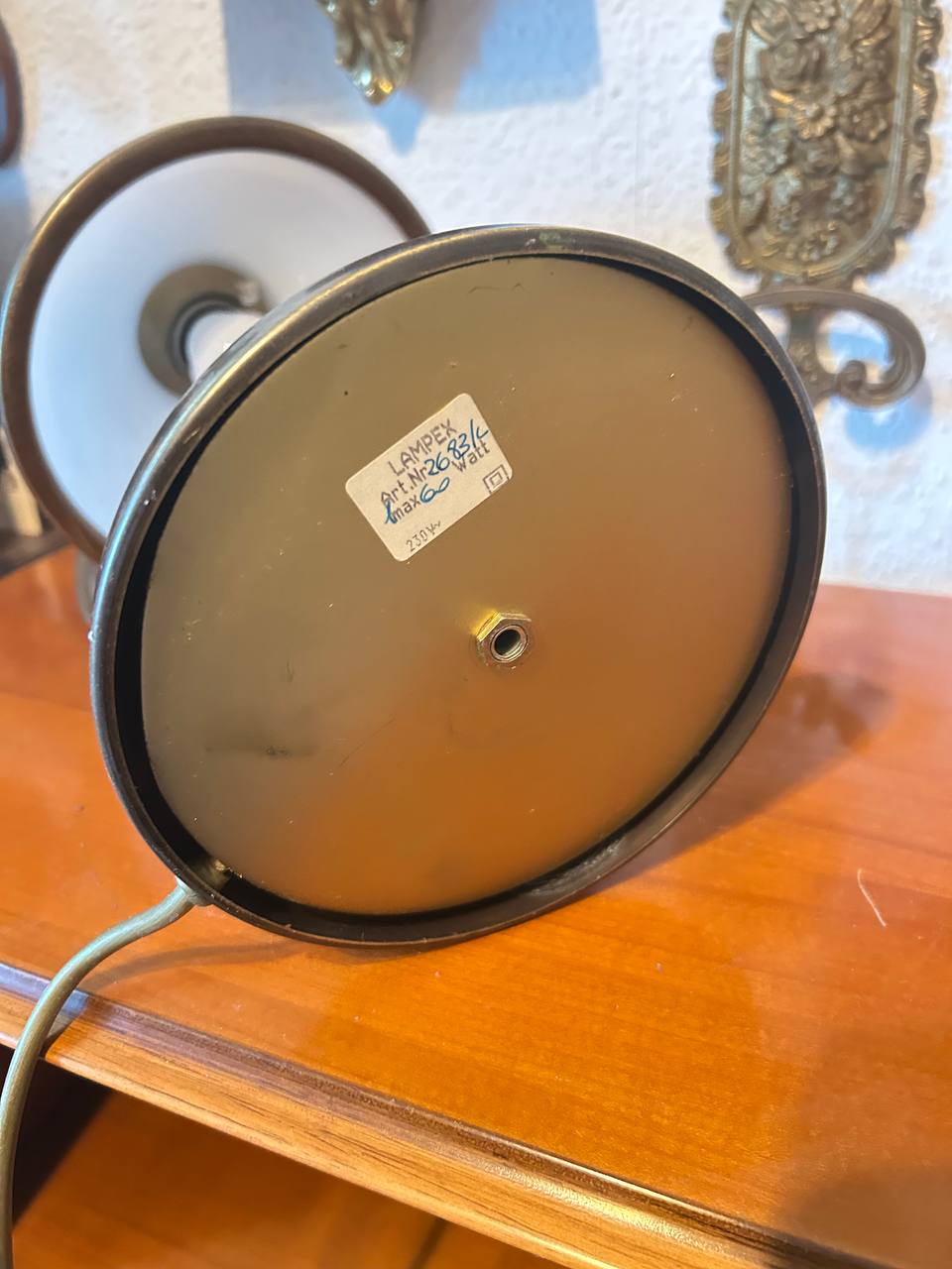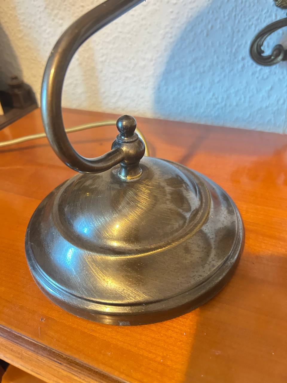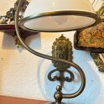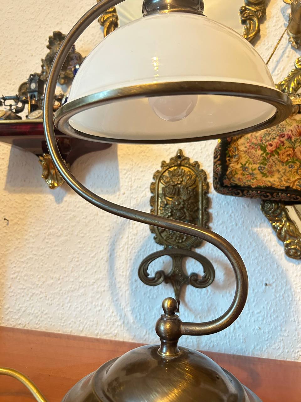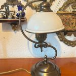Массивная настольная лампа со стеклянным плафоном и изящно изогнутой ножкой.
