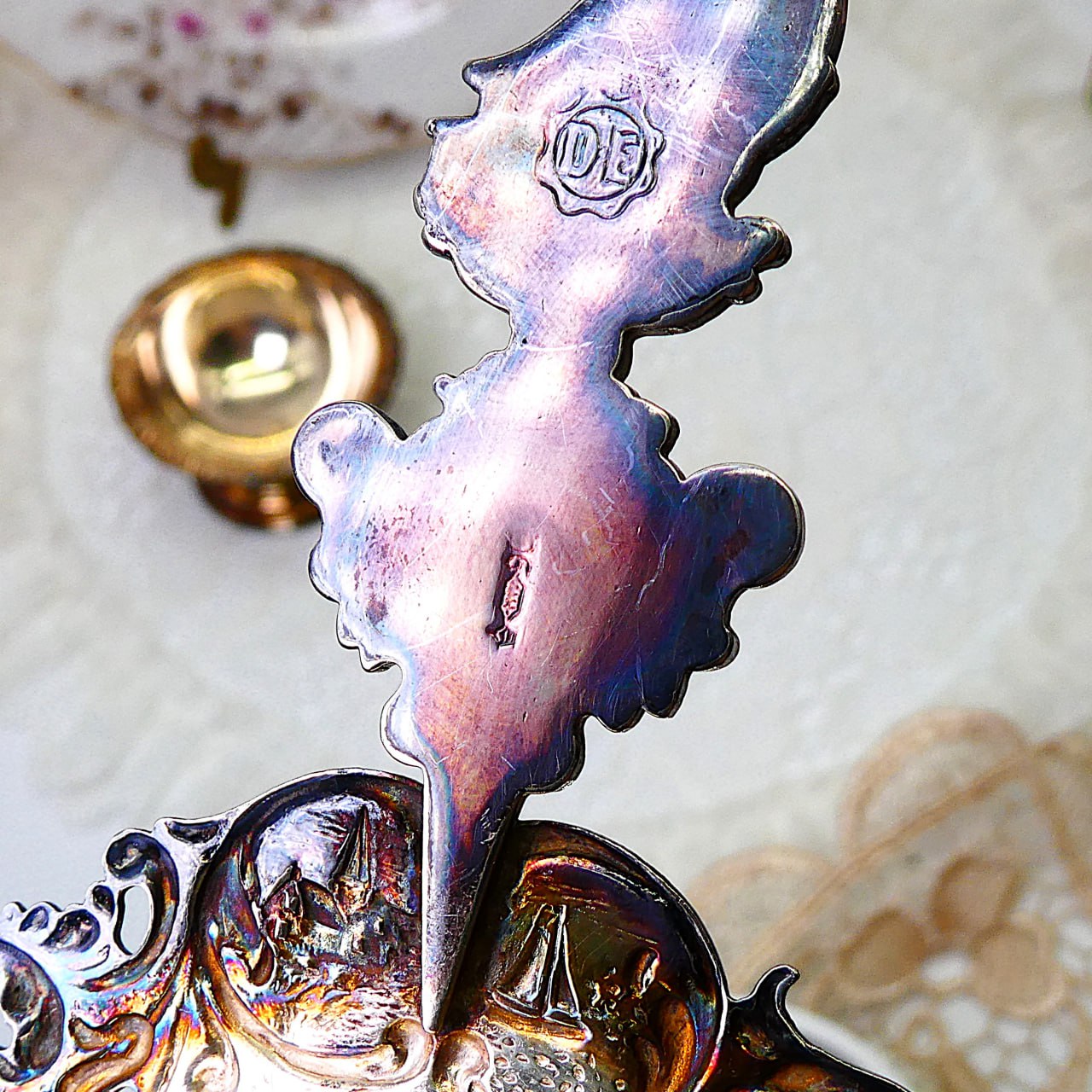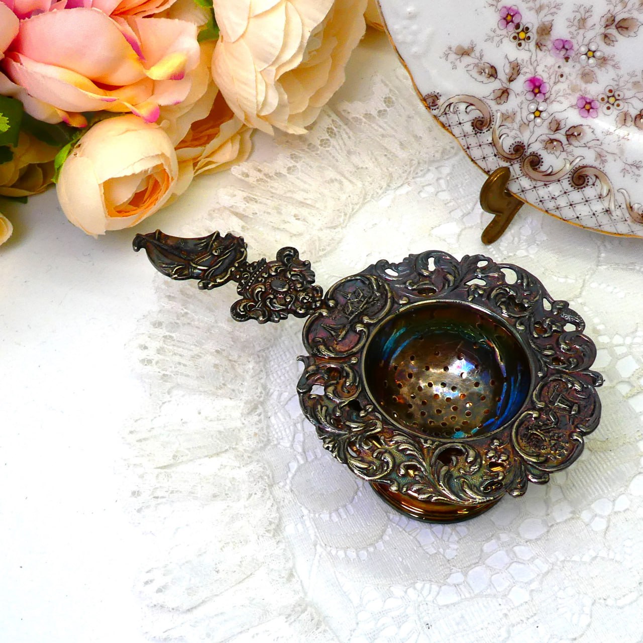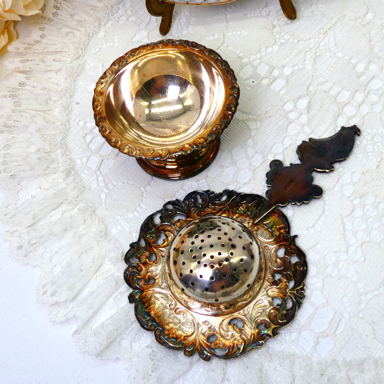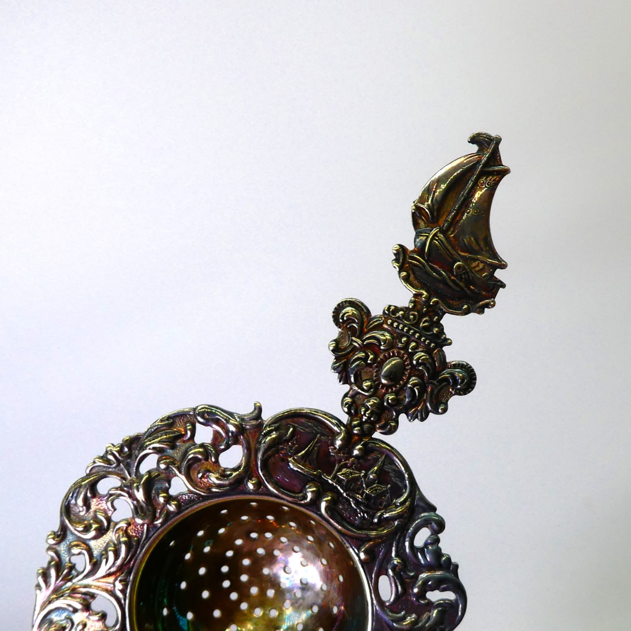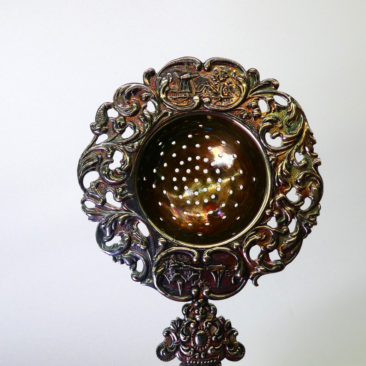 Невероятно красивое посеребренное ситечко с капельником. Клеймо DE - Douwe Egberts. Голландская компания Douwe Egberts основана в 1753 году и действует до сих пор . Голландии принадлежало много колоний, и компания возила из них экзотические фрукты, продукты, шоколад, чай, кофе. Douwe Egberts заказывали подарки для своих клиентов у ювелирных компаний и маркировали предметы своим клеймом.