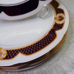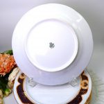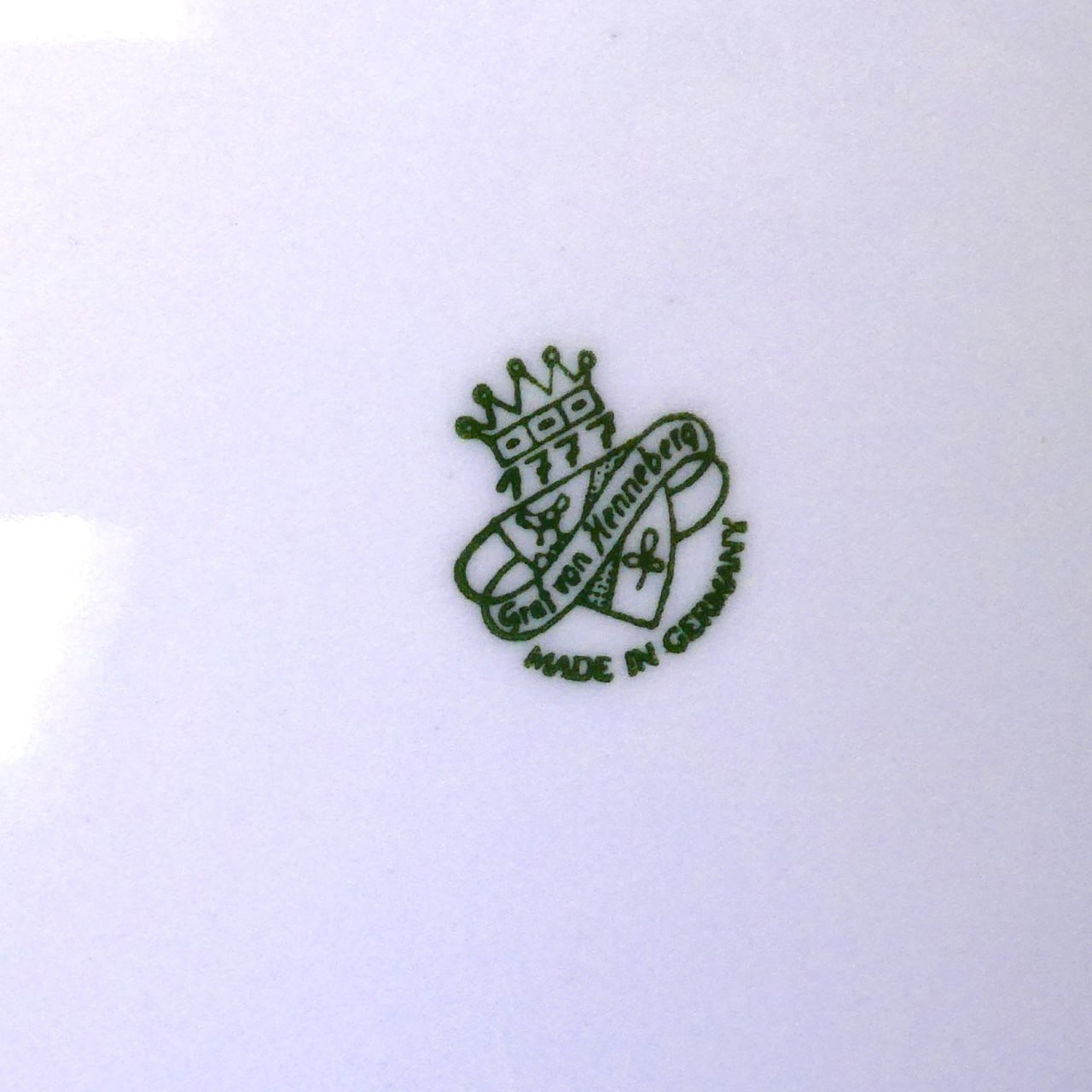 Роскошная столовая тарелка м из твердого высококачественного фарфора. Можно использовать как для подачи вторых блюд, так и как подстановочную тарелку. Широкая кобальтовая кайма с золотой сеткой и медальонами сияет под лучами света. Датой основания производства Graf von Henneberg в Ильменау считается 1777 год, что и отражено на клейме данной мануфактуры. Данное клеймо используется с 1991 г.