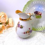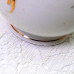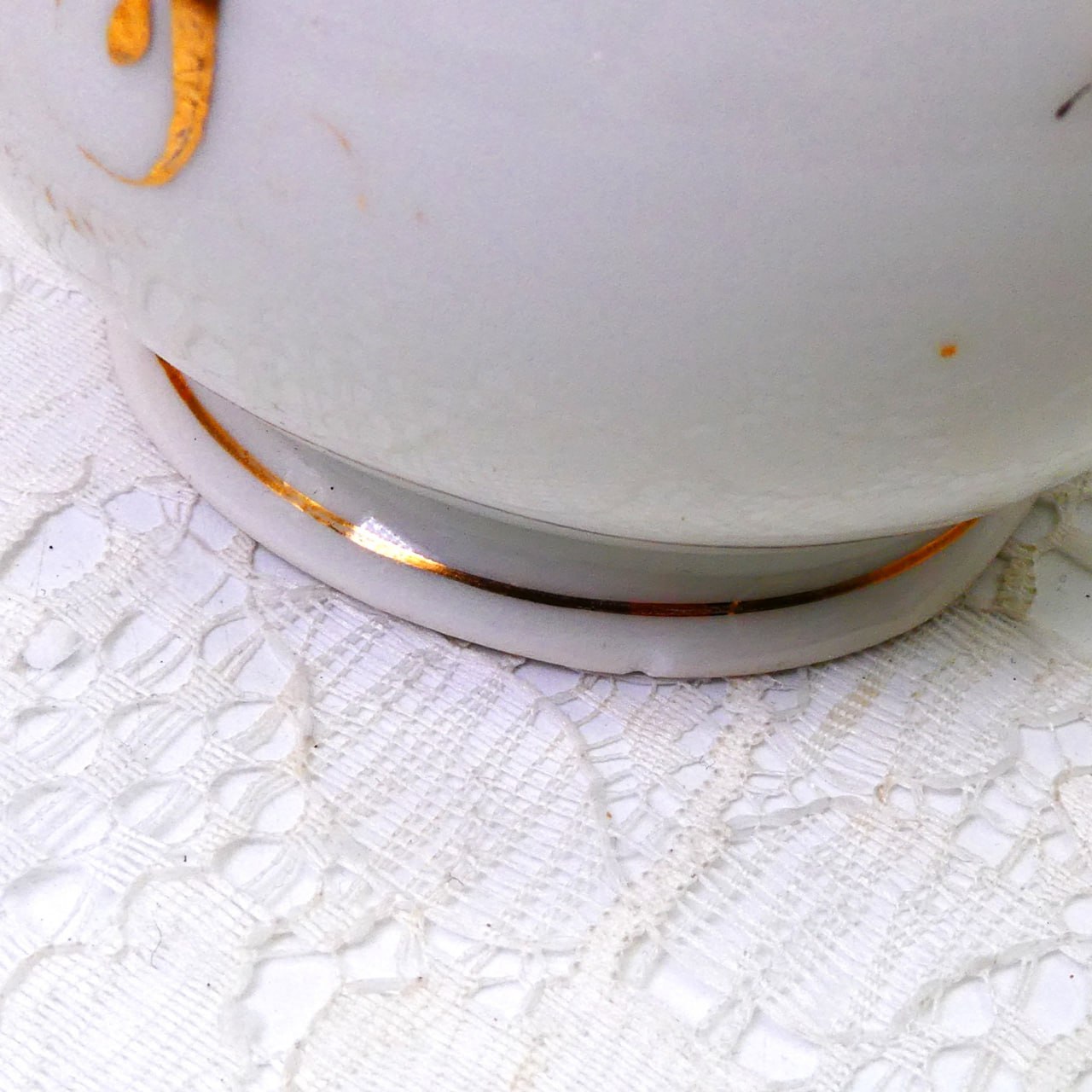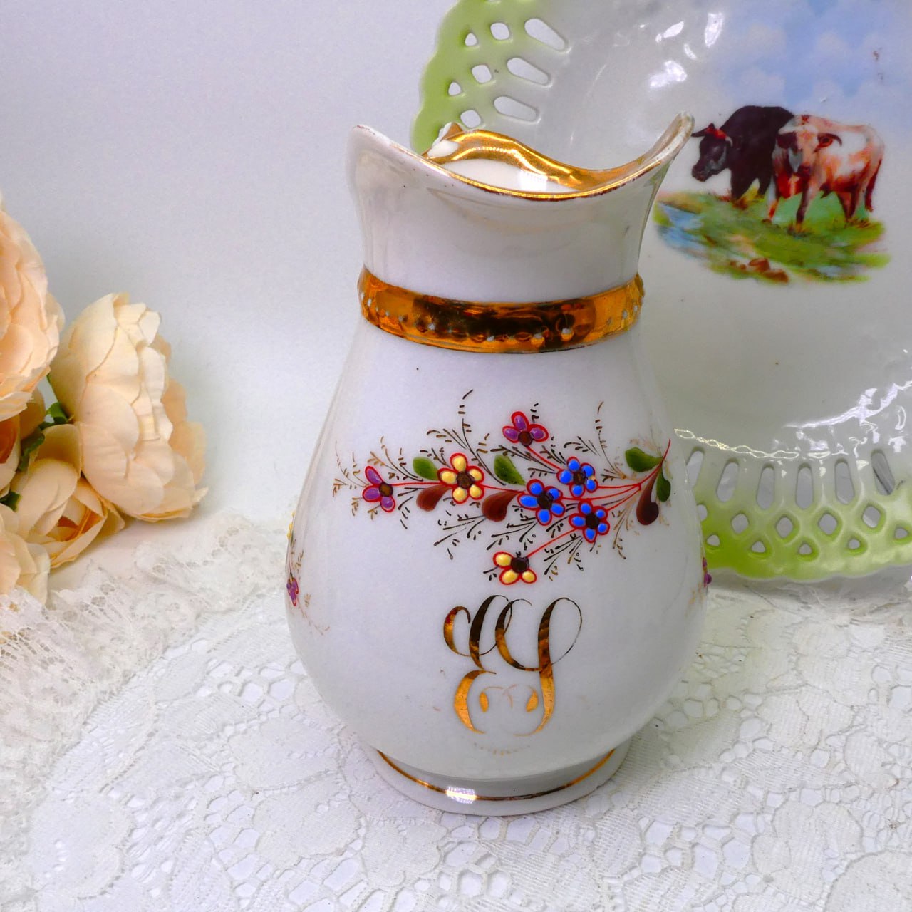 Старинный молочник классической формы. Деколь с ручной подрисовкой, монограмма золотом. На молочнике скол на ободке и на нижней части.