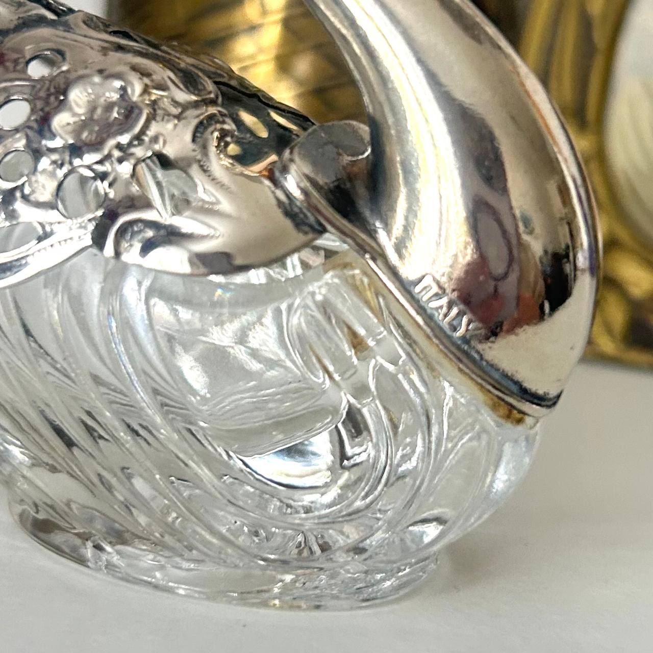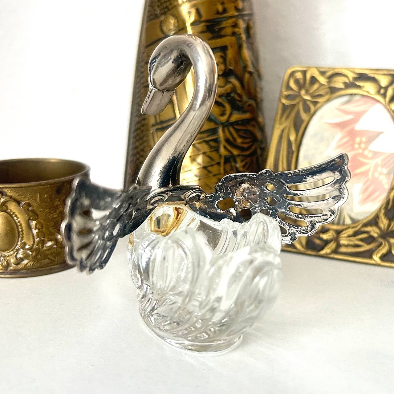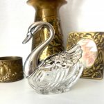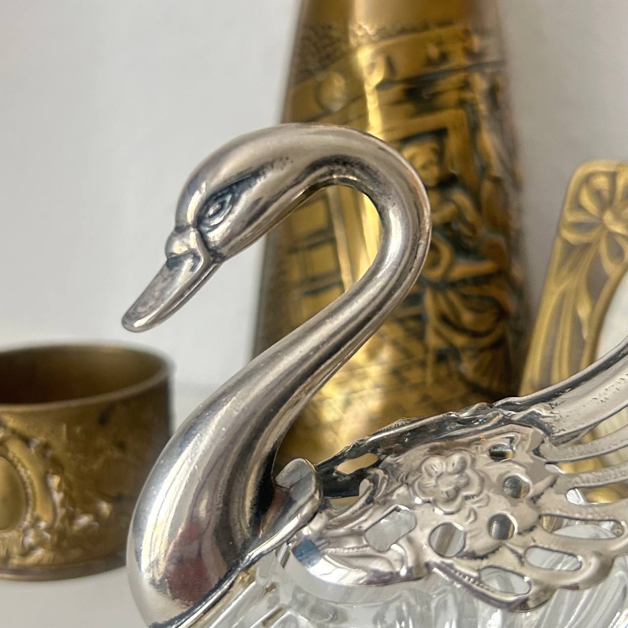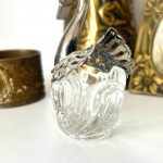 Хотите особенную солонку? Присмотритесь к этому изящному лебедю итальянского производства. Металл (похоже на посеребрение), толстостенное стекло.
